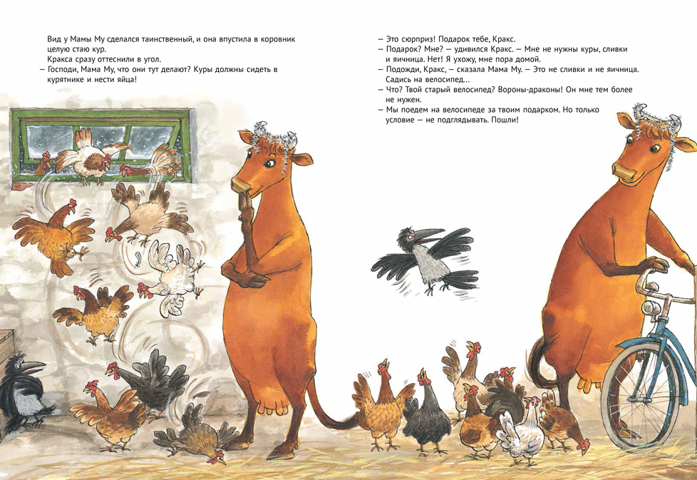 Каждая книга о Маме Му и ее друге Краксе — это забавная история о любознательной и задумчивой корове и ее друге воро́не. Герои оказываются в ситуациях, с которыми сталкиваются дети, — идут в бассейн, катаются на снегокате, учатся читать, — и познают мир вместе с читателями.