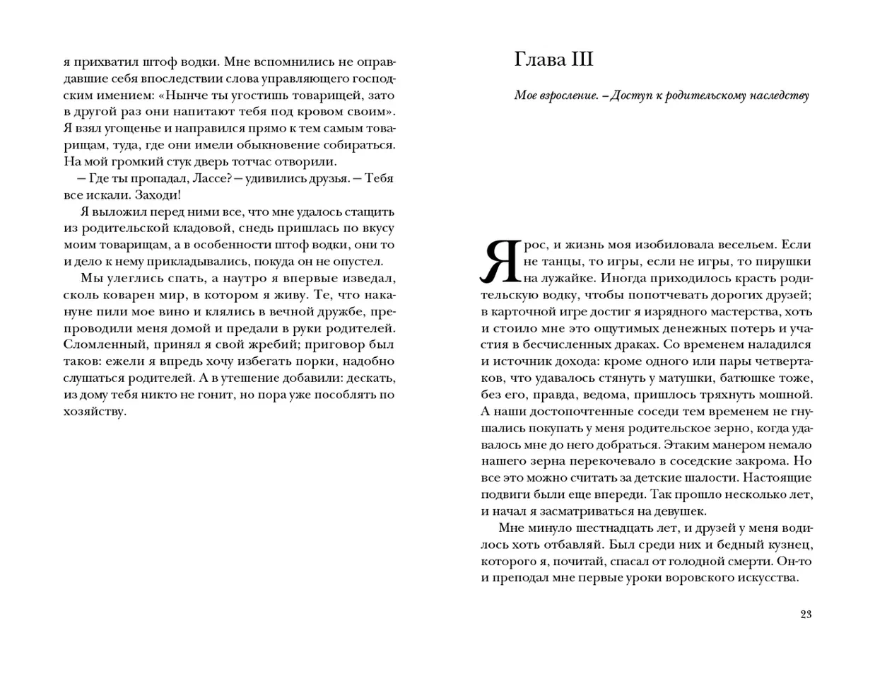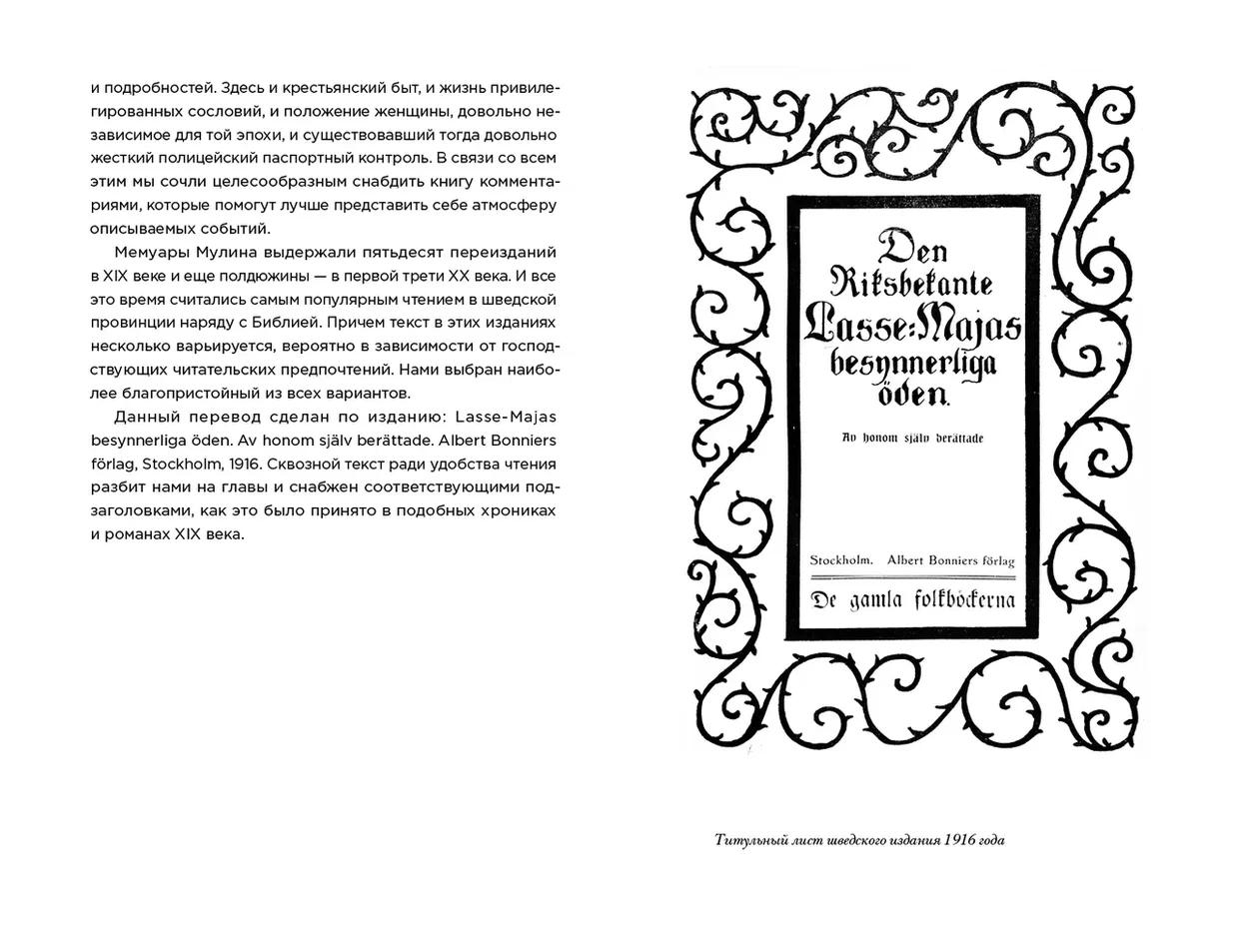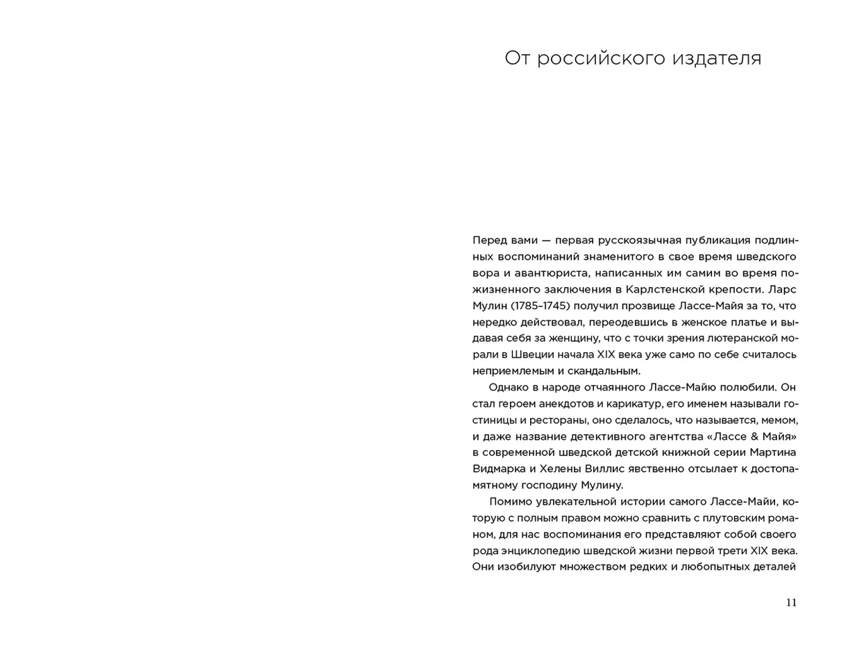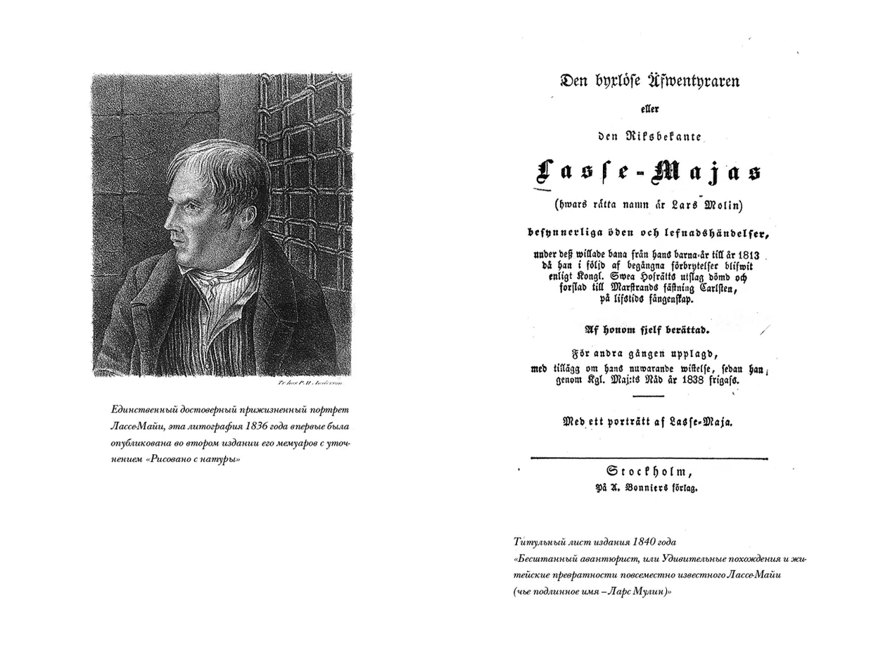 Вора и авантюриста, прозванного «Лассе-Майя», в начале XIX века знала вся Швеция. За свои многочисленные уголовные подвиги Ларс Мулин — ибо таково было его подлинное имя — в конце концов угодил в тюрьму и написал там мемуары, остроумные и увлекательные, как плутовской роман, запечатлев в них современные ему быт и нравы, в том числе и арестантские. Популярность этих без конца переиздававшихся воспоминаний надолго пережила автора: еще в середине 1930-х годов в провинции, согласно одному из свидетельств, читали «в основном Лассе-Майю да Библию». Надпись на мемориальном камне, установленном в честь Лассе-Майи, гласит: